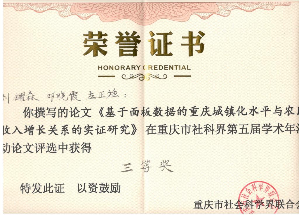 据悉,我院农业硕士生导师刘耀森教授、邓晓霞教授、左正强教授提交的论文《基于面板数据的重庆城镇化水平与农民收入增长关系的实证研究》获重庆市社科界第五届学术年会活动论文评选中获得三等奖。
