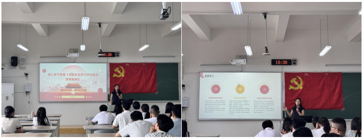 会上,陈吕同志结合条例内容,从修订背景切入,指出当前部分党政机关存在隐性浪费现象,强调修订《条例》是全面从严治党、堵塞制度漏洞的必然要求,对建设节约型机关、引领社会风尚具有重要意义。她还结合“垃圾分类”等细节,强调从日常小事践行节约。谈及落实举措,陈吕同志提出通过专题培训强化学习、拓宽群众监督渠道、实行终身追责等机制,确保制度落地。她号召党员从自身做起,节约水电、反对浪费,以实际行动带动身边同学树立“节约光荣”意识。