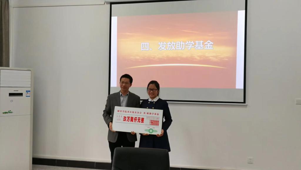 2015级会计学4班廖雪景代表受助学生发言,她表示要积极向学长学姐们学习,心存感激,坚持理想,刻苦学习,早日成才。随后蒋义括代表校友分会将助学基金发放到受助同学手中。
