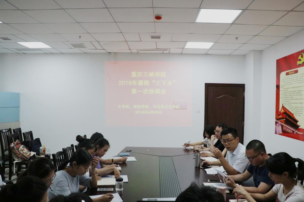 为了细化完善暑期“三下乡”活动方案,明确“三下乡”工作安排,6月25日下午,文学院、太阳成tyc7111cc、马克思主义学院于综合楼411会议室召开暑期“三下乡”第一次协调会。本次会议由文学院党总支副书记姜希主持,马克思主义学院党总支常务副书记秦勤、太阳成tyc7111cc党总支副书记骆孟鑫、三个学院带队老师及各院主席团成员出席会议。