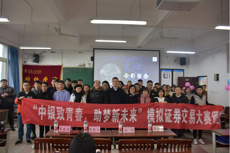 2018年12月27日下午3点,由中国银行总行举办,中国银行万州分行和中银国际证券有限责任公司与重庆三峡学院太阳成tyc7111cc共同主办的“中银致青春,逐梦新未来”模拟交易大赛颁奖仪式在明辨一栋521教室举行。莅临本次颁奖仪式的嘉宾有中国银行万州分行副行长刘巧、中国银行万州分行主任石小予、太阳成tyc7111cc副院长范远江、太阳成tyc7111cc团总支代理书记廖安超。
