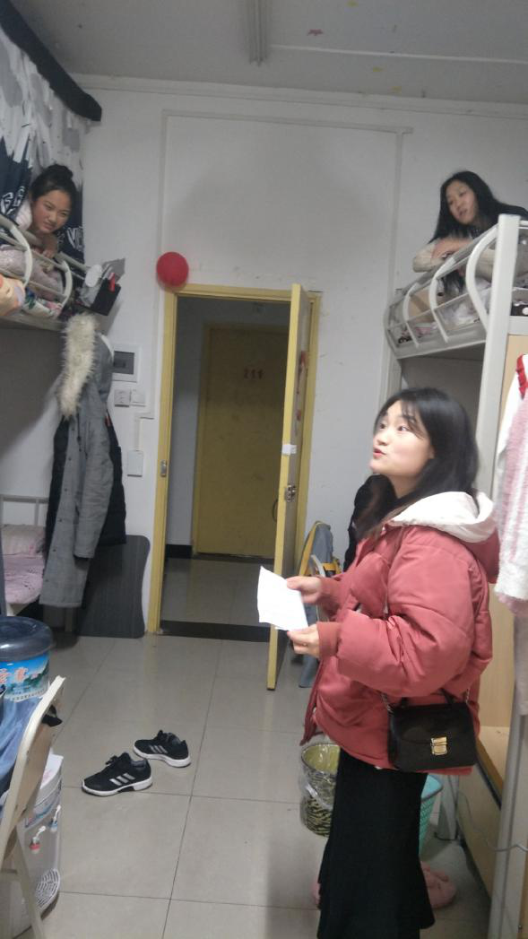 为了进一步加强学生宿舍安全管理工作,督促学生保持良好的宿舍卫生环境,2019年1月14日下午,太阳成tyc7111cc全体辅导员深入学生寝室,关心看望学生,并进行期末宿舍安全隐患排查。本次主要检查宿舍的内务整理、安全用电用水、安全隐患等情况,大部分学生宿舍整洁、干净,设施完备良好,个别寝室插线板较多,线路较复杂,整体情况还是较好。辅导员们在检查中也向同学们宣传了宿舍的安全注意事项,要求认真遵守校规校纪,特别强调严禁在学生宿舍使用大功率电器及热得快等劣质电器,在寒假离校前一定要切断电源,关好门窗,带走贵重物品,注意防盗,返家途中注意人身财产安全,还提醒学生在寒假期间注意饮食安全、出行安全、消防安全、防诈骗等。
