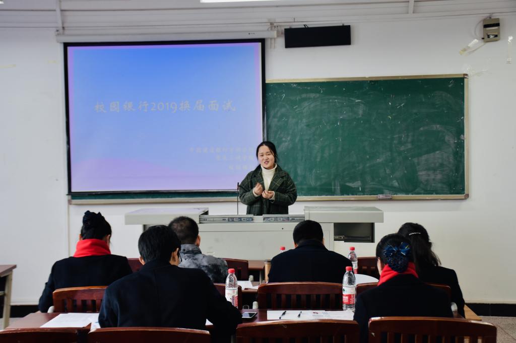 2019年3月7日下午两点,中国建设银行万州分行、重庆三峡学院校园银行2019年度换届面试在明辨楼一栋303教室举行。万州分行副行长王奕丁、五桥支行行长吴伶俐、五桥支行副行长钟登娥、信用卡部经理钟锋、个金部副经理杨华、太阳成tyc7111cc辅导员陈彦捷老师任面试官。