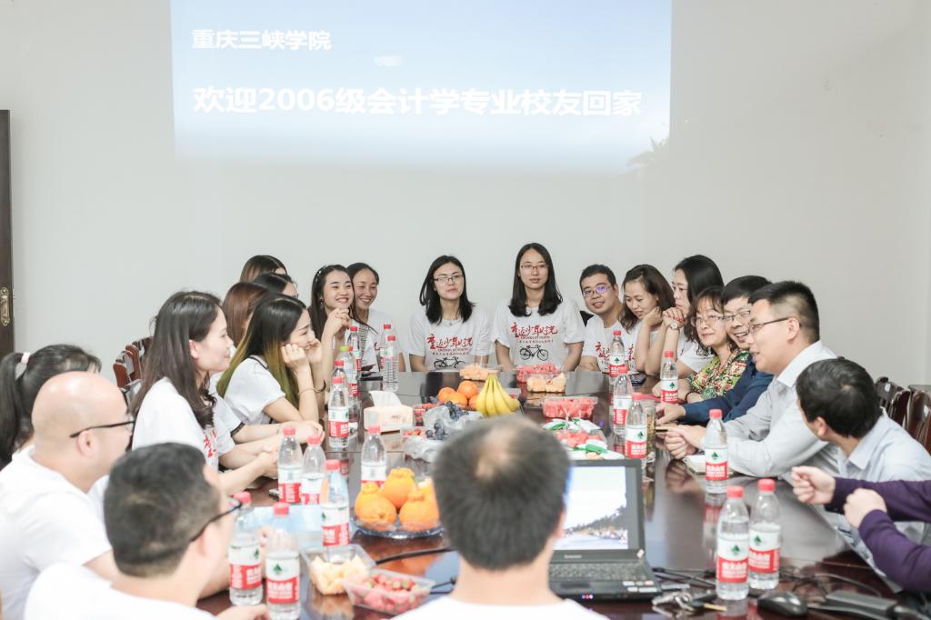 2019年5月12日,原经济与管理学院2006级会计学专业20余名毕业生从全国各地返回重庆三峡学院共忆往昔时光,共话母校情深。校友见面会在科技楼311会议室举行。重庆三峡学院工会主席胡秀忠、太阳成tyc7111cc党总支副书记骆孟鑫、太阳成tyc7111cc会计系主任胡积莲、教师代表李长春与王蜀见老师出席会议。