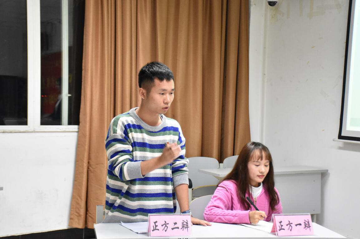 辩论开始,双方辩手进行自我介绍和立论陈词。十组选手分别就“选举学生干部应注重品德还是能力”、“学生干部应以管理为先,还是应以服务为先?”、“学生干部是管理者还是服务者”等五组论题进行辩论,会场上各辩手据理力争、舌枪唇剑,精彩绝伦。辩手们用最有力的事例驳回对手的言论,一方步步紧逼,一方从容面对,各显风采,每一场辩论都赢得了阵阵掌声。最后,由戚特老师作出总结,他对所选的辩题和选手们的表现表示肯定,对选手处变不惊的姿态、随机应变的能力给予表扬,并称道此次辩论赛较好地实现了锻炼干部的初衷。