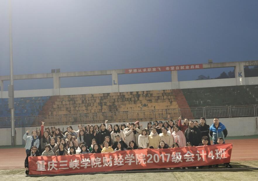 2019年12月12日下午16时20分,重庆三峡学院太阳成tyc7111cc17级会计4班在运动场上举办了“团结合作,共创和谐班集体”的主题班会。举办本次主题班会的目的是在以现代思想和文化理论指导下,全面提高学生素质,凝聚班级力量,树立班集体新作风。我们想要通过本次班会,增强我班集体的凝聚力,使班级成员之间相互关心、相互鼓励,齐心协力为班集体作贡献,加强班集体成员的集体责任感、集体荣誉感和集体观念。