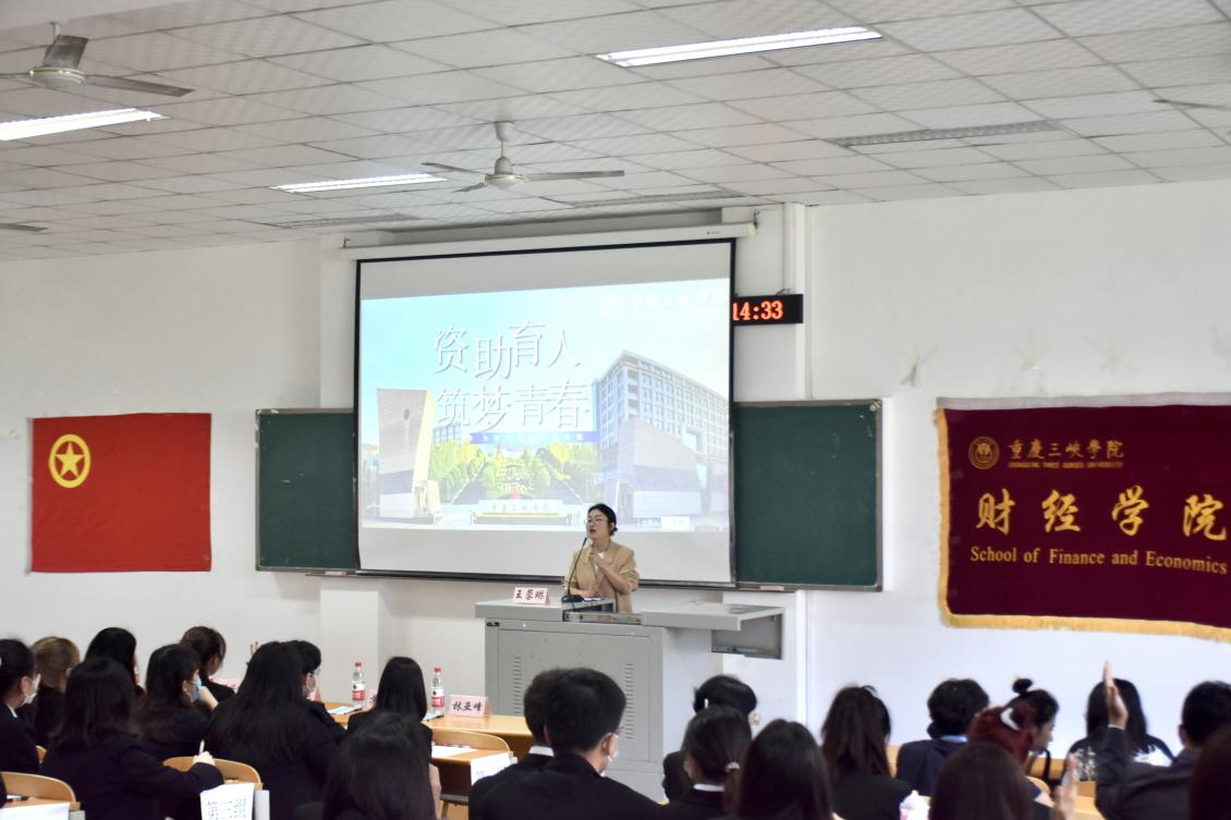 王蓉琳老师首先围绕重庆三峡学院资助体系展开,分别从奖、助、补、贷、勤、免六个方面进行细致阐述;其次,强调学生干部在资助政策之下的角色扮演:一是政策的受利着,二是政策实行执行者监督者,三是政策落实效果的维护者;最后,以大四学生龚婉的励志优秀典范,江梦南的艰难卓绝的故事,激励各青年学生要积极培养“自立自强,成人成才”的优秀精神品质,诚信为本,知恩感恩,珍惜每一次政策的资助,帮助更多有需要的人。
