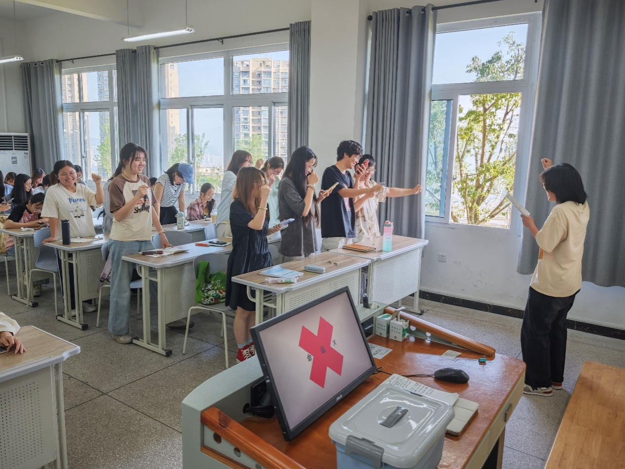在“压力回忆档案馆”环节,同学们匿名写下考试压力来源,并投入“压力档案箱”。随后,利用毛绒玩具开始了击鼓传花游戏,当音乐停止,手持“花”的同学抽取压力问题卡并分享应对方法,现场气氛既紧张又活跃。游戏结束后,心理委员黄柏溪科普心理健康知识,分享心理调节技巧,为同学们提供科学解压思路,引导同学们正确认识和应对压力。在“学霸经验分享”环节,取得优异成绩的余娅霏、刘晓银同学从复习技巧、心态调整、考前突击策略等方面倾囊相授,干货满满。在“命运X”环节里,小组通过在“挂科名单”上标记学科并喊出应对措施,增强备考决心。班会结束后,同学们纷纷在班级频道分享学习目标或鼓励金句,持续巩固班会成果。