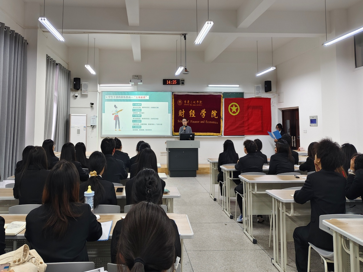 培训会上,王老师从学生干部的职责定位、学生干部的修炼指南与工作方法三方面展开,强调学生干部应牢记服务同学的初心,平衡好学业与工作,发挥模范带头作用。在学生干部能力修炼方面,王老师从“五项素质、六大意识、九项能力”进行深入阐释。她提出,学生干部需具备过硬的政治素质、道德素养,树牢方向意识、大局意识、纪律意识,不断提升学生工作的实战能力。结合学院学生工作,王老师着重讲解了活动策划、流程管控、团队沟通与协作方面的技巧,为学院举办高质量学生活动提供了方法指导。