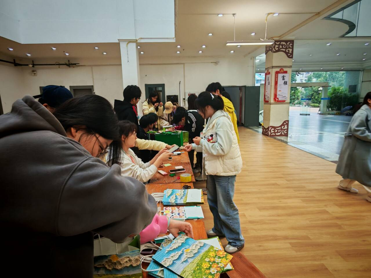 本次活动吸引了众多同学踊跃参与,现场气氛温馨而热烈。活动共设置三个环节:在“创意工坊”环节,同学们亲手制作个性收纳盒,在锻炼动手能力的同时,也为寝室生活增添了一份实用与美感,完成即可获得首枚活动印章;随后的“知识问答”环节聚焦寝室安全常识,通过轻松有趣的问答形式,进一步增强同学们的安全防范意识,成功通过者即获第二枚印章;在“爱心传递”环节,同学们在“解忧树洞”中写下真诚的暖心留言,传递温暖与关怀,完成即可集齐第三枚印章。参与者凭盖满三枚印章的便签即可在签到处兑换一份精美小礼品,留下专属的温馨纪念。
