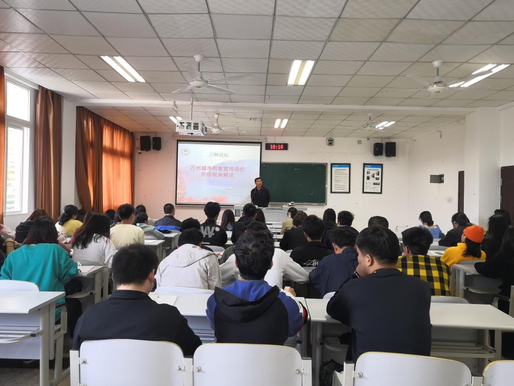 王志清教授分别从“万州地名的历史变迁”“万州尘世形象宣传语的知识生产过程”“三生石”的诗歌文献综述、“诗句内容的民俗解读”“城市形象宣传语彰显的文化底蕴”五个方面进行详细讲解。王志清教授为学生详细讲解了重庆地名的类型化特征以及万州地名的一系列历史变迁,使同学们清楚的了解了万州城市形象宣传语“三生有幸,平湖万州”的历史来源。最后通过对相关诗歌和民俗文化的分享,加深了大家对万州城市形象宣传语的整体理解和印象。